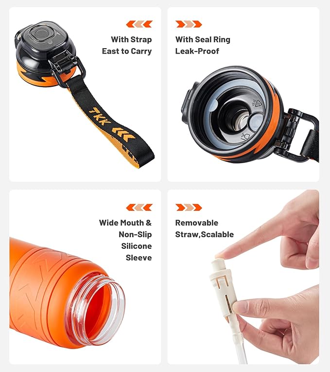 TKK Sports Water Bottles with Removable Straw 29 oz Leak-proof Flip Top Lid BPA Free Tritan Bottles with Strap for School, Fitness, Gym, Outdoor, Orange-Black