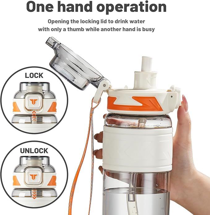 - FLIP TOP LID & HANDY STRAP: Press by the finger on the bottle lid, then it will pop up easily. If you push under the button to lock the bottle mouth, then it can prevent accidentally touching the switch. With a carry strap and anti sweat grip design,it makes you easier to carry it to anywhere.