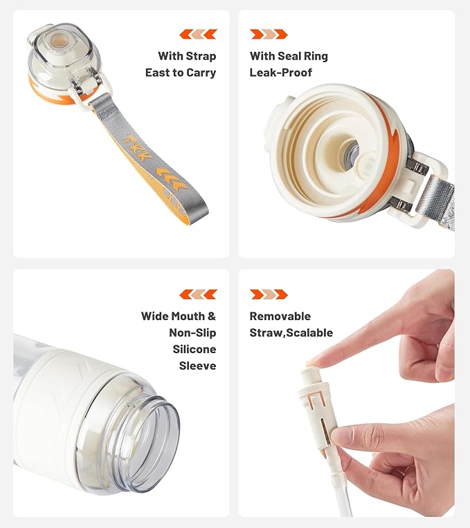 TKK Sports Water Bottles with Removable Straw 29 oz Leak-proof Flip Top Lid BPA Free Tritan Bottles with Strap for School, Fitness, Gym, Outdoor, White