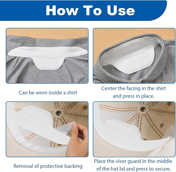 - Easy to Apply and Remove: Simply peel, stick and press the sweat band for hats onto the inside brim. Each sweat pad adheres firmly, yet removes cleanly without leaving sticky residue, making them practical for quick replacement