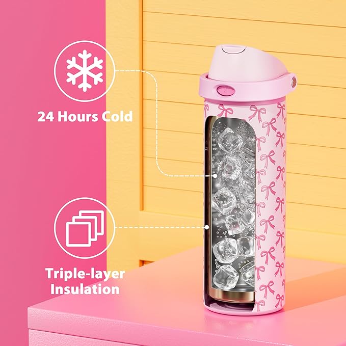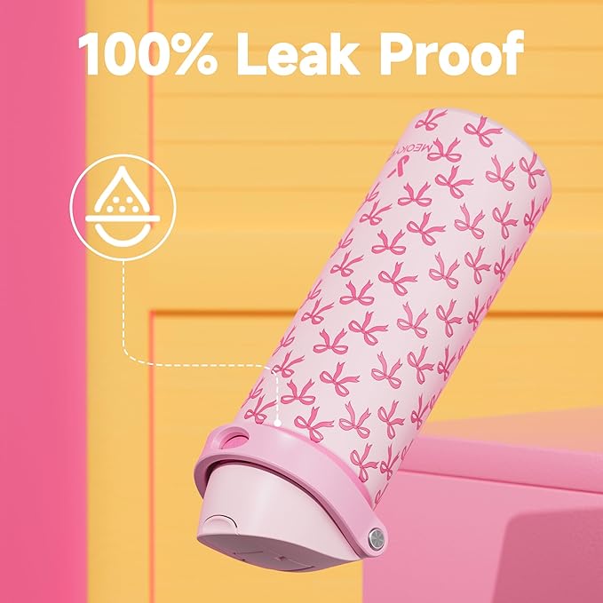 24 oz Insulated Water Bottle for Women: Meoky Stainless Steel Metal Water Bottle with 2-in-1 Straw and Spout Lid - Leak Proof, Cold for 24 Hours, Protective Silicone Base, BPA-Free for School, Bow