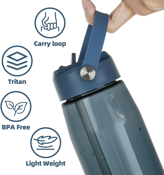 OLDLEY 32 oz Water Bottle with Straw, Leakproof Sports Water Bottle with Carry Strap, BPA-Free Large Water Bottles for Home,Travel, School, Outdoors, Gym, Tritan, Ink Blue