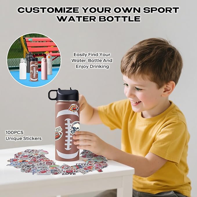 - 100 PCS Football Stickers:High definition printing stickers are made of high quality vinyl, non-toxic, waterproof, durable, remove without residues and repositionable. Each sized about 2.2inch. They can create their own personalized insulated water bottle, making it easy to find their sports water bottle and enjoy drinking. Stickers can also be placed anywhere they like, such as cups, helmets, football bats, etc.