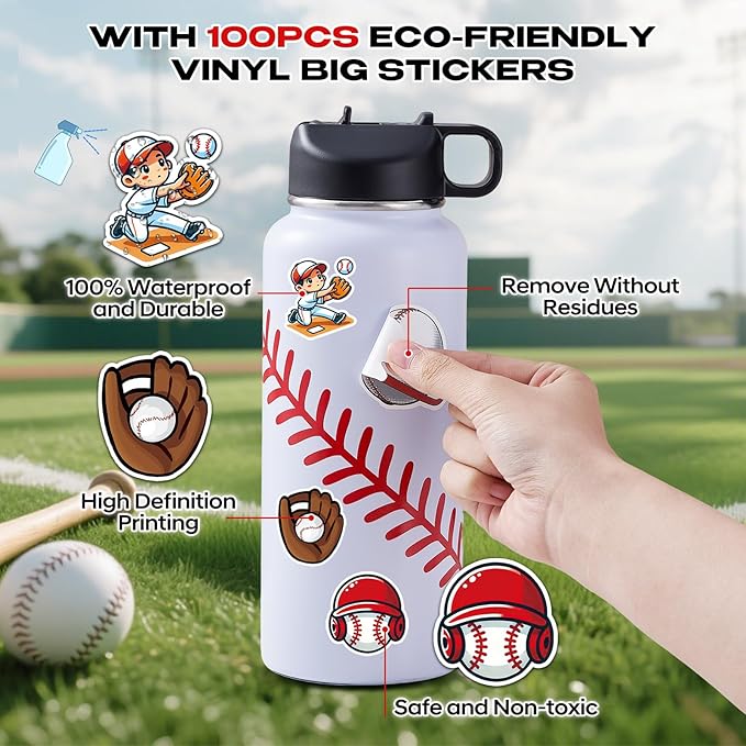 - 100 PCS Baseball Stickers:High definition printing stickers are made of high quality vinyl, non-toxic, waterproof, durable, remove without residues and repositionable. Each sized about 2.2inch. They can create their own personalized insulated water bottle, making it easy to find their sports water bottle and enjoy drinking. Stickers can also be placed anywhere they like, such as cups, helmets, baseball bats, etc.