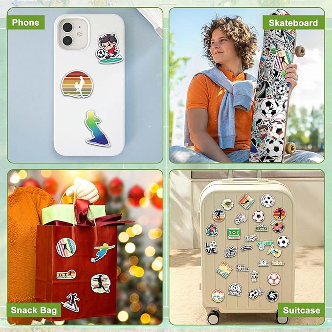 - 100 PCS Soccer Stickers:High definition printing stickers are made of high quality vinyl, non-toxic, waterproof, durable, remove without residues and repositionable. Each sized about 2.2inch. They can create their own personalized insulated water bottle, making it easy to find their sports water bottle and enjoy drinking. Stickers can also be placed anywhere they like, such as cups, helmets, soccer bats, etc.