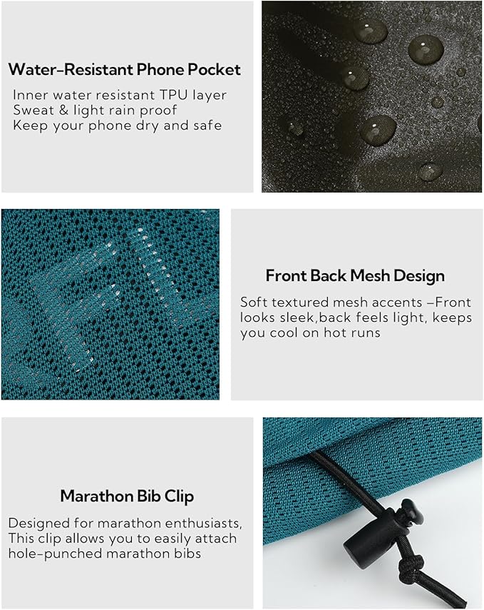 - Multiple Pockets for Easy Organization: With 3 pockets, this running bag helps you store items orderly. Water resistant phone pocket fits phones up to 7". Two side zippered mesh pockets securely hold earphones, energy gels, tissues, and keys. Never lose your essentials again!