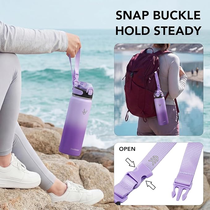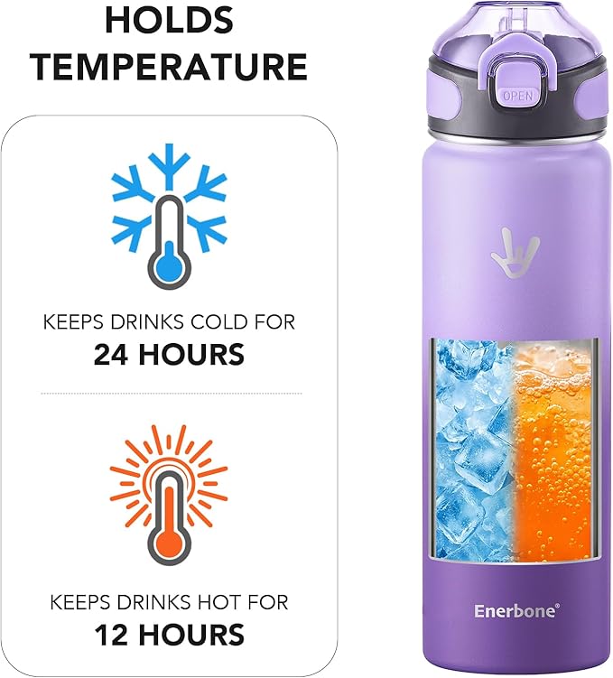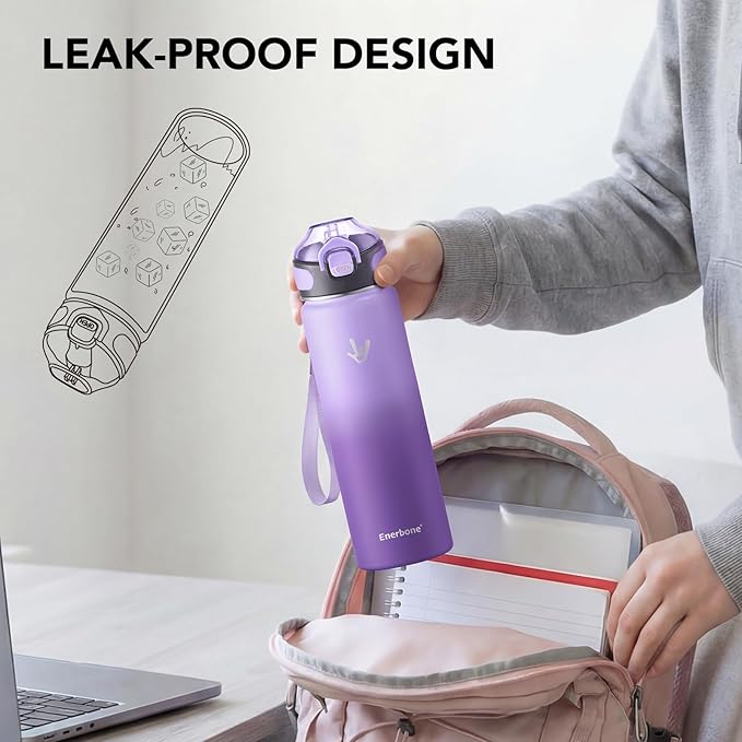 Enerbone 24 oz Insulated Water Bottle, 24oz 2 Lids (with Straw/No Straw), Stainless Steel Double Wall Flask for Hot & Cold Drinks, Leakproof Travel Bottle for Gym, Office, Hiking