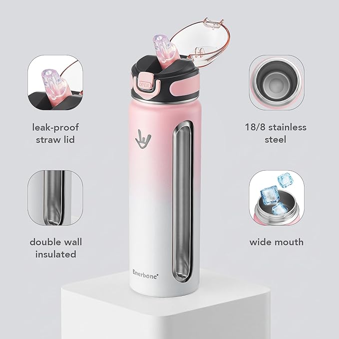 Enerbone 24 oz Insulated Water Bottle, 24oz 2 Lids (with Straw/No Straw), Stainless Steel Double Wall Flask for Hot & Cold Drinks, Leakproof Travel Bottle for Gym, Office, Hiking