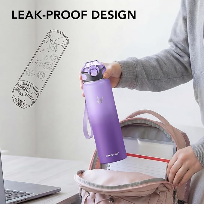 Enerbone 32 oz Insulated Water Bottle, 32oz 2 Lids (with Straw/No Straw), Stainless Steel Double Wall Flask for Hot & Cold Drinks, Leakproof Travel Bottle for Gym, Office, Hiking